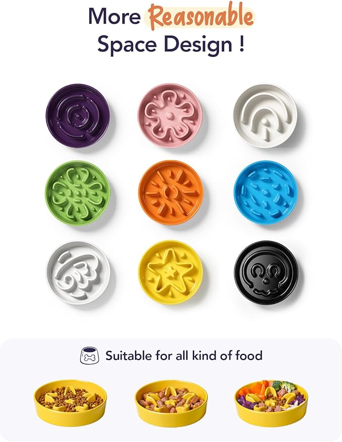 - Slow Down Eating, Bring Dog A Healthy Diet: Fast-eating dogs experience bloat, regurgitation, and obesity easily. Our slow feeder dog bowl design with the ridges and maze pattern helps your dog to eat slower than 10 times. Your dog could change his overeating behavior through a challenge and fun mealtime