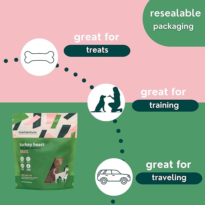 Momentum Carnivore Nutrition Freeze-Dried Turkey Heart Dog Treats – Single-Ingredient, Dog & Cat Treats – High-Protein, Grain-Free– 3 oz Bag