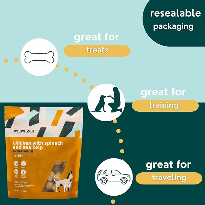 Momentum Carnivore Nutrition Freeze-Dried Chicken, Spinach & Sea Kelp Dog Treats – Single-Ingredient, Dog & Cat Treats – High-Protein, Grain-Free– 3 oz Bag