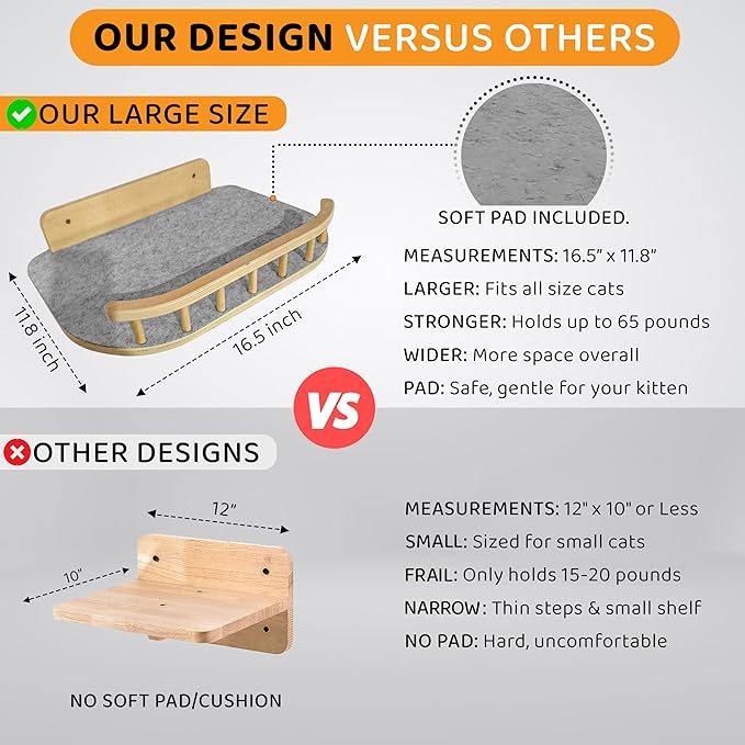 - PREMIUM HARDWOOD & HEAVY DUTY SUPPORT – This wall-mounted set includes 3 steps and 1 cat bed, crafted from top-quality wood and built to support up to 65 lbs, ideal for large cats. The smooth finish and plush elements provide comfort while encouraging active play and exploration.