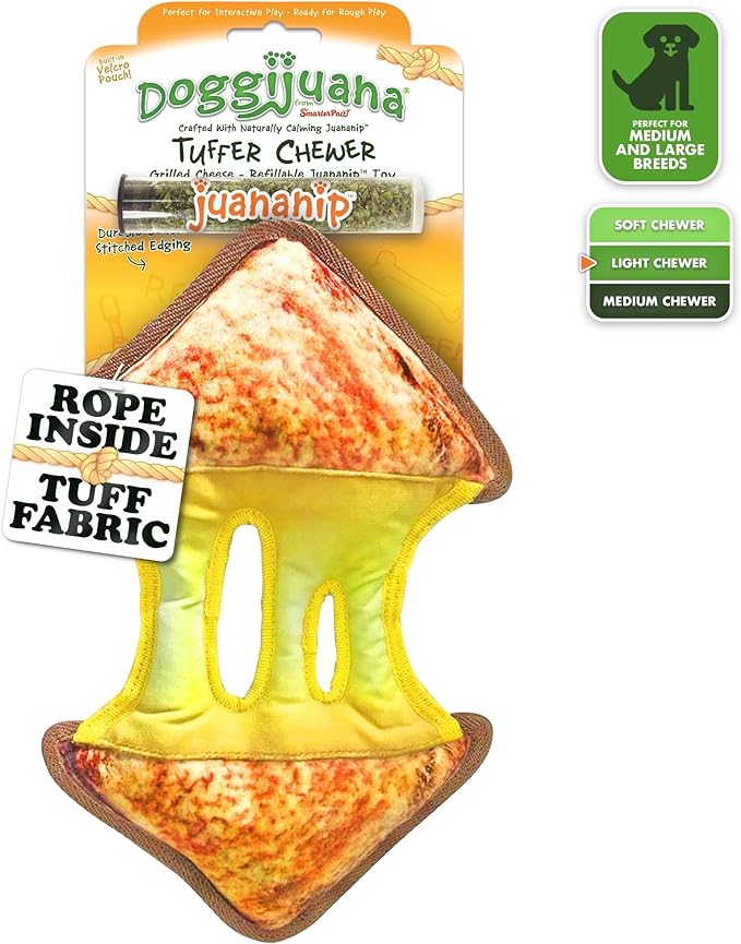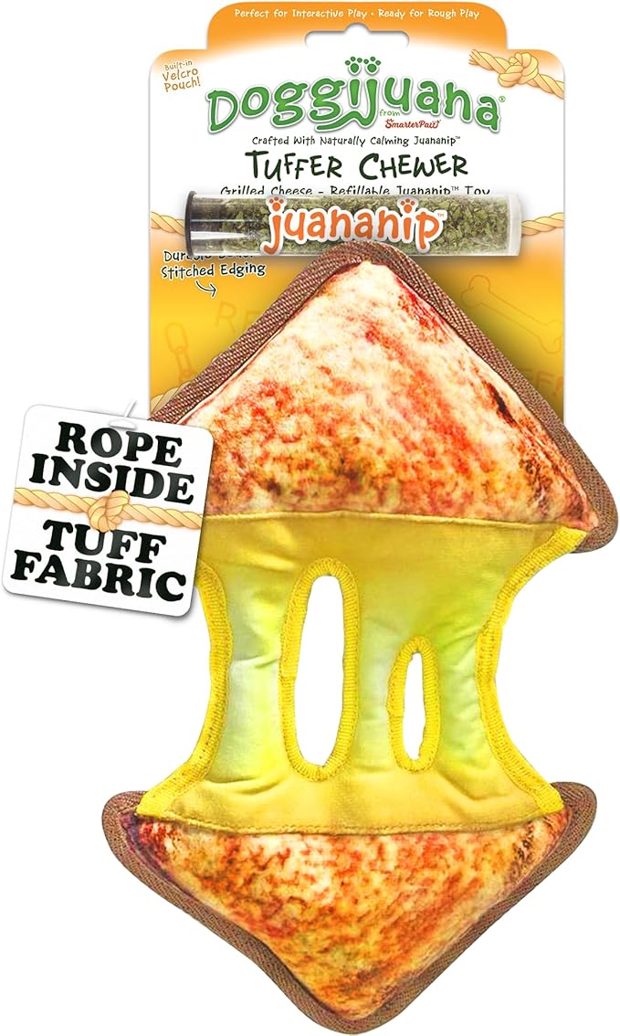 Doggijuana Tuffer Chewer Plush Dog Toy | Funny Dog Toy Plush with Juananip Catnip for Dogs | Calming Aid for Dogs | Interactive Squeaky Chew Toy for Play (Grilled Cheese)