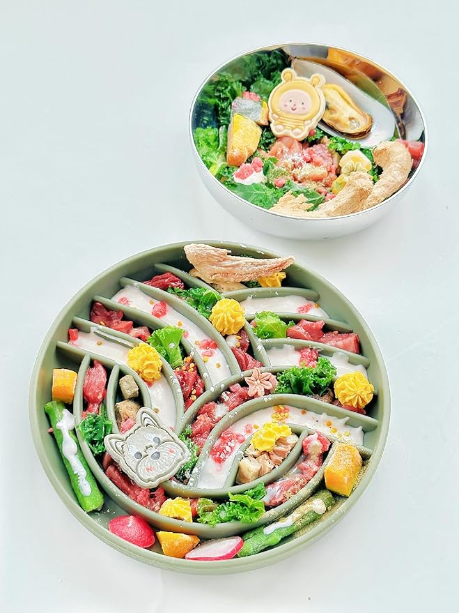 - The slow feeding dog dishes work with dry food or wet food(yogurt, peanut butter, raw food, canned food etc.) Slow food bowls help dogs with healthy digestion from preventing dogs swallow