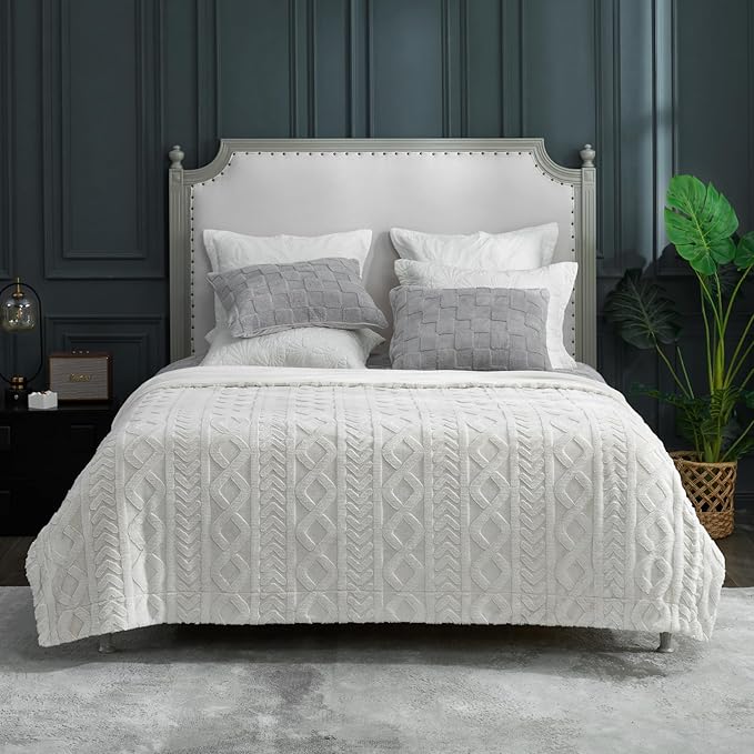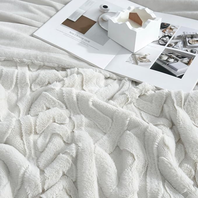 Cozy Bliss Faux Fur Throw Blanket for Couch, Jacquard Fuzzy Plush Soft Thick Winter Throw Blanket for Sofa Bed Living Room Bedroom, 90 * 90 Inches Beige