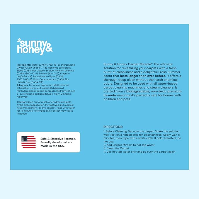 - Sunny & Honey Power Clean: Sunny & Honey Carpet Miracle is your go-to carpet cleaner solution for machines and pet carpet cleaner needs. It tackles everything from dog accidents to holiday spills, leaving your home smelling fresh with a light summer scent