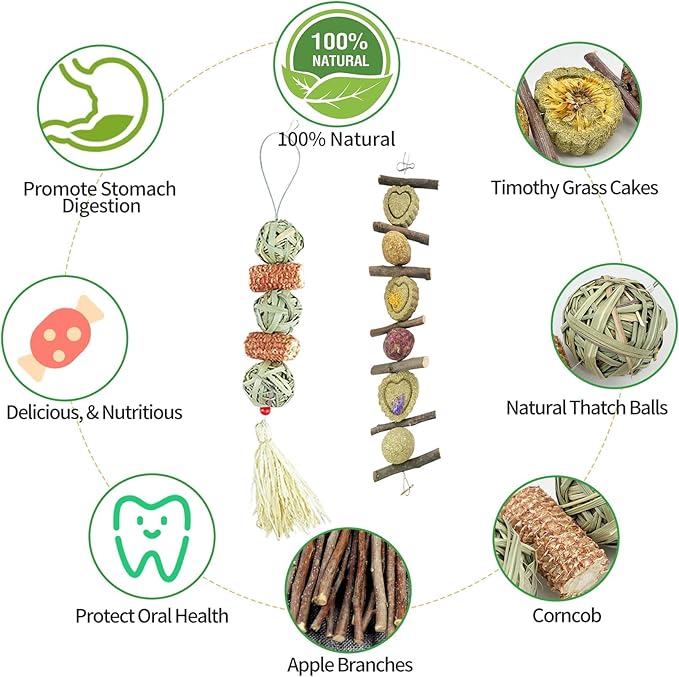 - Safe Material : Rabbit scratching board is made of natural wood, which is safe for pets to chew. Corn cob grass balls and flower grass strings are made of fresh natural grass with corn cobs and fruit wood, which is good for digestion and increase appetite