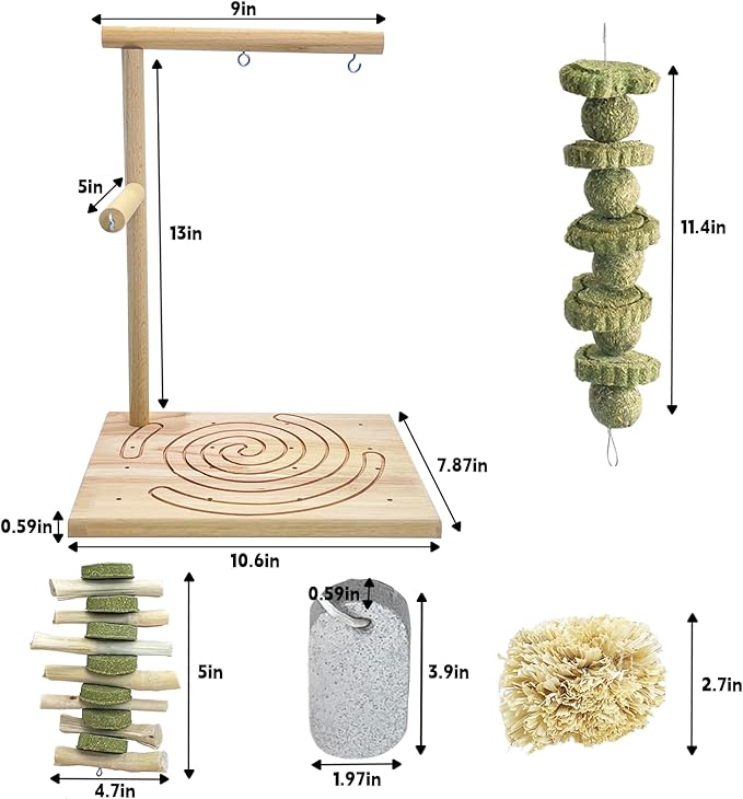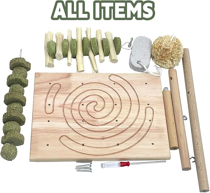 - 【Packaging Includes】The rabbit toys package contains 1 x Wooden Scratching Board Platform, 1 x Sweet Bamboo Grass Cake String Toy, 1 x Timothy Grass Cake and Grass Ball String Toy, 1 x Corn Leaf Ball Toy, 1 x Teething Stone Toy, 3 x Wooden Sticks and 1 x Screwdriver. Ideal for rabbits, hamsters, guinea pigs, chinchillas and other small animals.
