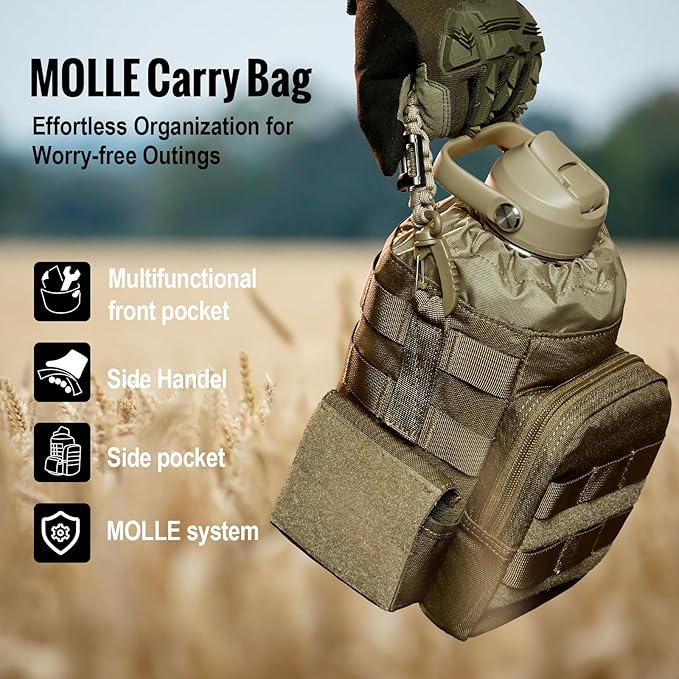 - The Complete Hydration Solution: Elevate your hydration experience with our water bottle and included accessories. From 3 different lids and 2 straws for versatile use with any beverage, to a cleaning brush for easy maintenance, we've got you covered. Plus, our tactical water bottle also comes with a spacious bag and paracord handle that can be worn crossbody or carried by hand, with extra pockets for storing small items you need for the day such as cell phones, keys, and cion or cash.