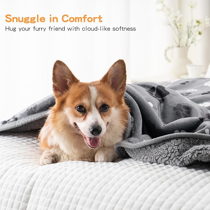 Waterproof Dog Blankets Pet Blanket 50"x60", Soft Fluffy Sofa Car Bed Protector, Reversible Sherpa Fleece Dog Blanket for Large Dogs (Dark Grey-Paws)