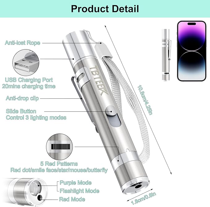 - 7 in 1 Modes: Scroll the gear to pick 5 red patterns(dots, smiles, mouse, stars, butterflies). The variety of patterns sparks pet's interest, enhancing your and cats' interaction. 3 lighting modes can be adjusted, red for cat playing, purple for checking cat skin health /money, white for mini flashlight