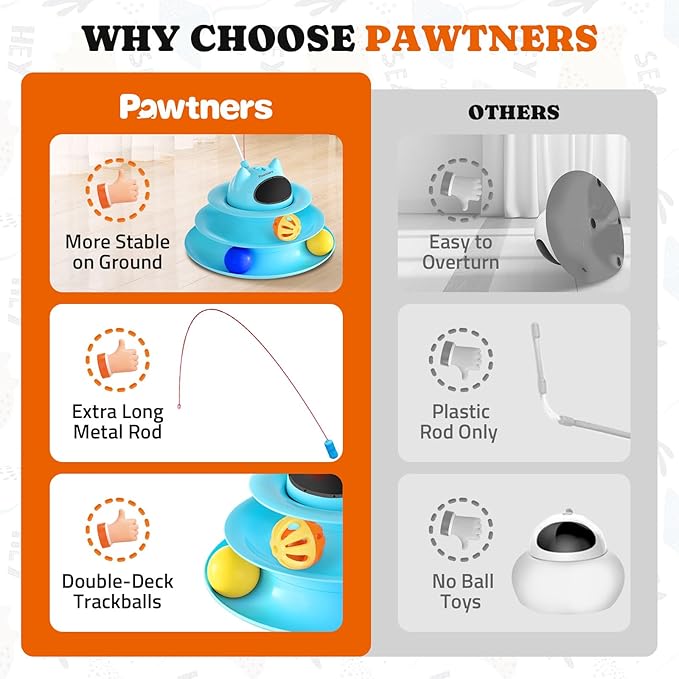 - 5-IN-1 CAT TOY: Pawtners' cat toy features 6 engaging elements: adjustable laser, hide and seek toy, shatterproof ABS rod, rotating metal wands(note: the head adopts a single slot design, only one can be used at a time), dual-track balls, bell ball, and DIY play box. Each detachable component trains feline focus while providing independent play, giving owners peaceful breaks