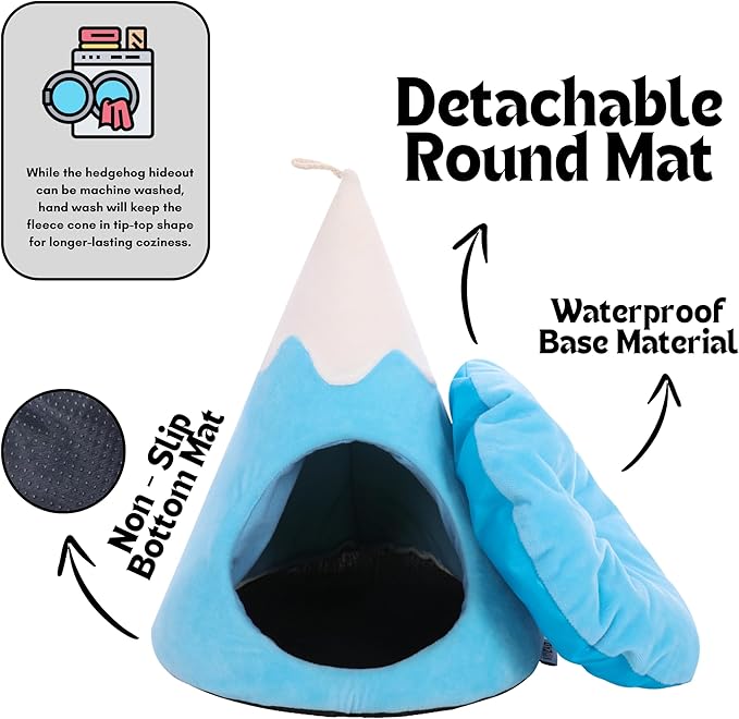 - [Effortless cleaning] - Our animal house features a detachable round mat that’s easy to wash separately, making it a breeze to keep your guinea pig cages fresh and clean! While the hedgehog hideout can be machine washed, hand wash will keep the fleece cone in tip-top shape for longer-lasting coziness.