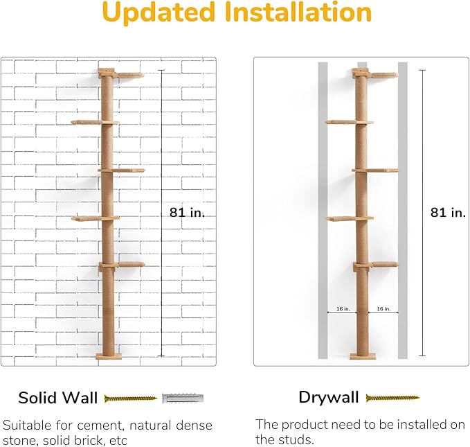 - STABLE AND SAFE - Benefit from its wall mounted design, the cat tree tower can give your cats a stable support for climbing and play. And each platform of the cat climbing tower is covered with jute rope, your cats will not slip-off easily when they use it, giving their more sense of security.