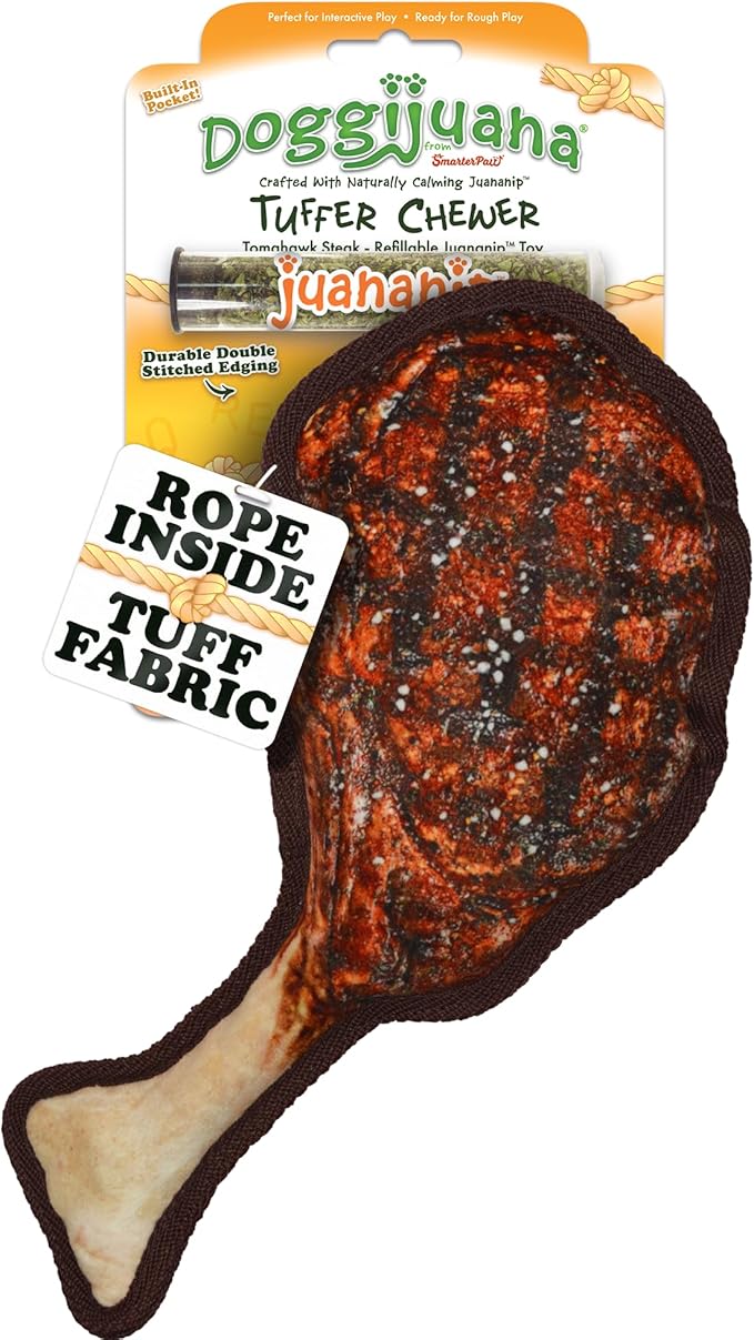 Doggijuana | Tuffer Chewer - Interactive Dog Toy with Juananip Refill | Refillable Durable Dog Toy for Engaging Play and Natural Calming (Tomahawk Steak Toy)