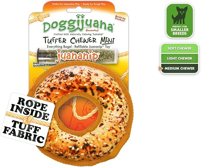 Doggijuana Tuffer Chewer Mini Plush Dog Toy | Funny Dog Toy Plush with Juananip Catnip for Dogs | Calming Aid for Dogs | Interactive Squeaky Chew Toy for Play (Bagel)