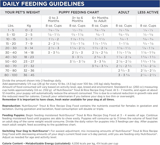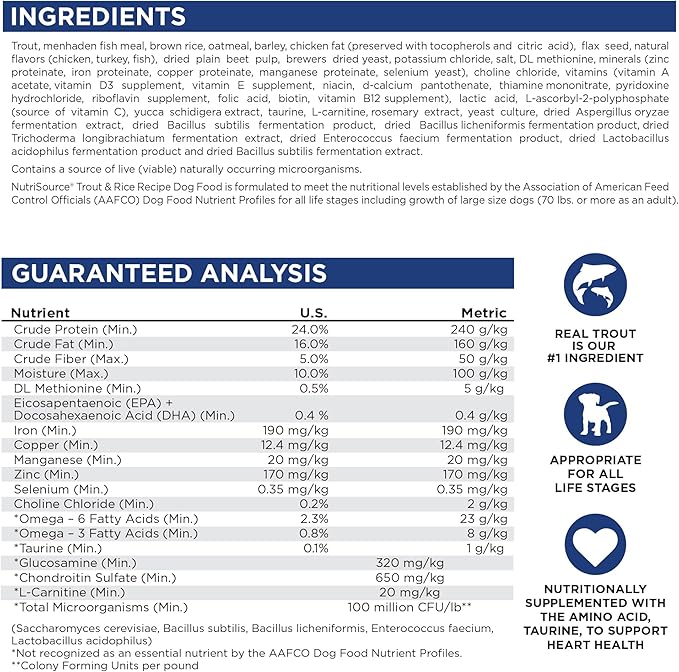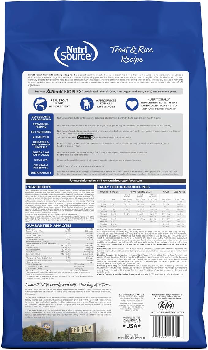 - As a member of our grain inclusive series, NutriSource Trout and Rice Dry Dog Food is formulated to meet AAFCO guidelines for all lifestages