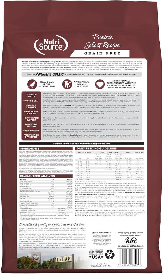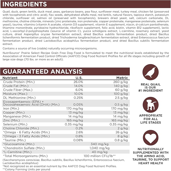 - As a member of our grain free series, NutriSource Quail and Duck Dry Dog Food is formulated to meet AAFCO guidelines for all lifestages