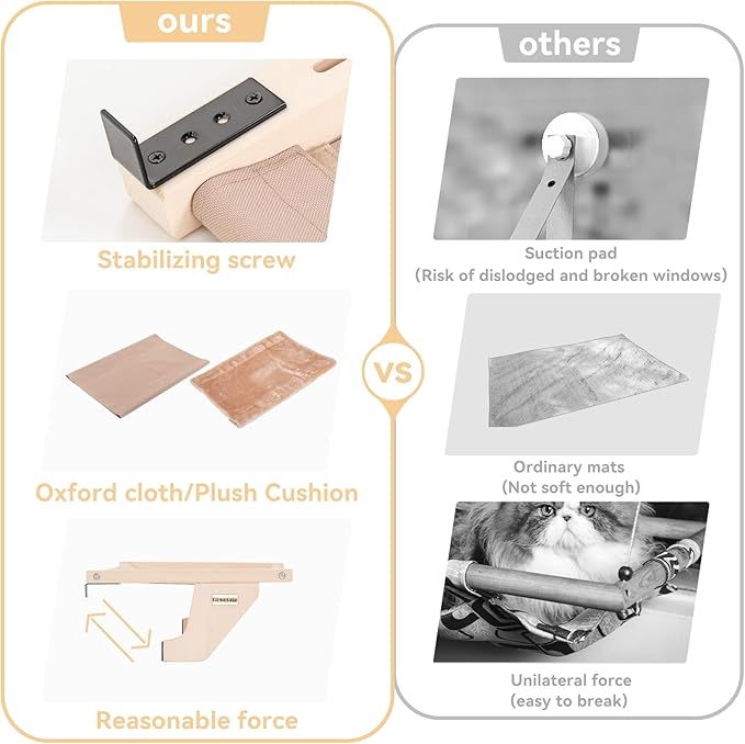 - No Drilling&Quick Assembly:Our cat window perch design is more stable&safe,by two extensible metal hooks fixed on the carrier,and supported by two wooden brackets,can adjust the appropriate width freely,well protect the window from concentrated force damage,also do not need to worry about falling off,this cat bed for window is widely used in doors,drawers,Windows,table partitions