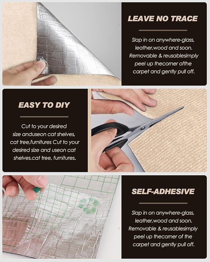- 【Self-Adhesive Convenience】This cat carpet mat is designed with a self-adhesive backing that is securely fastened using an environmentally friendly adhesive. Simple to install, simply peel off the backing and stick it to the desired surface to ensure a secure, hassle-free fit and maintain a firm grip.We also have additional eco-friendly adhesive and screw nails to help you better choose the scenarios you want to use.