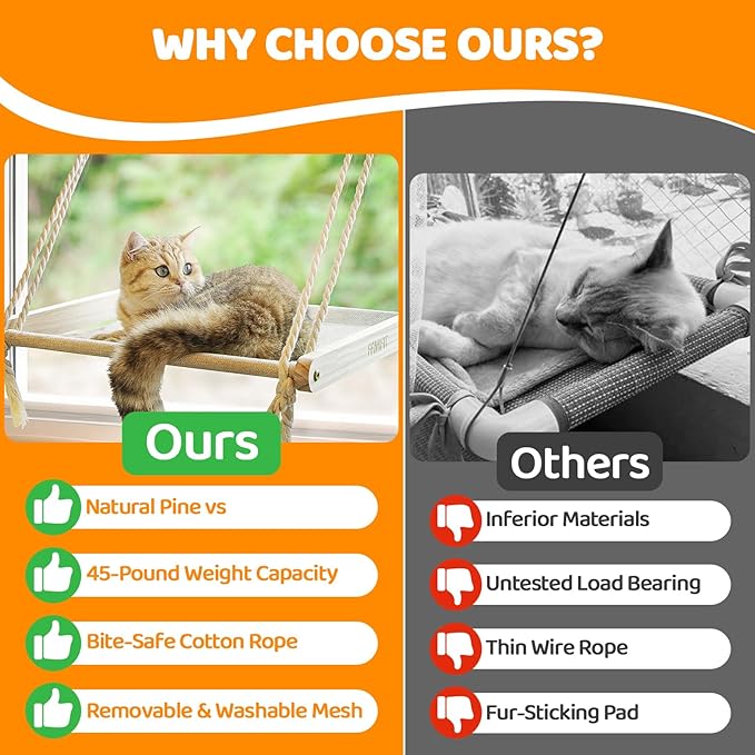 - Premium Pine Wood Frame: Crafted from high-quality pine wood, the Famifit Cat Window Perch boasts exceptional durability and natural charm. Unlike pressure-treated wood, pine wood's natural oils and decay resistance protect against rot and insect infestation, creating a healthier and safer environment for your feline. This ensures a long-lasting, eco-friendly perch free from harmful chemicals and pests.
