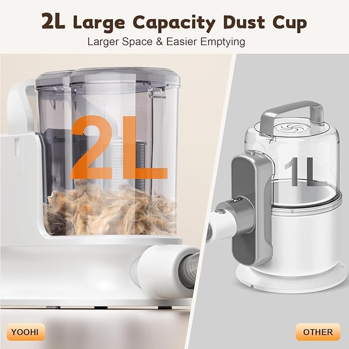 - Easy Empty Dustbin: The dog grooming vacuum kit comes with a 2L upgraded dust collection cup and a thicker hose, so you can finish grooming in one go, whether it's multiple pets or a large dog.