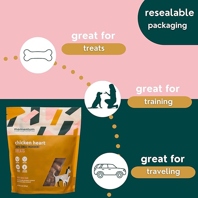 Momentum Carnivore Nutrition Freeze-Dried Chicken Heart Dog Treats – Single-Ingredient, Dog & Cat Treats – High-Protein, Grain-Free– 3.5 oz Bag