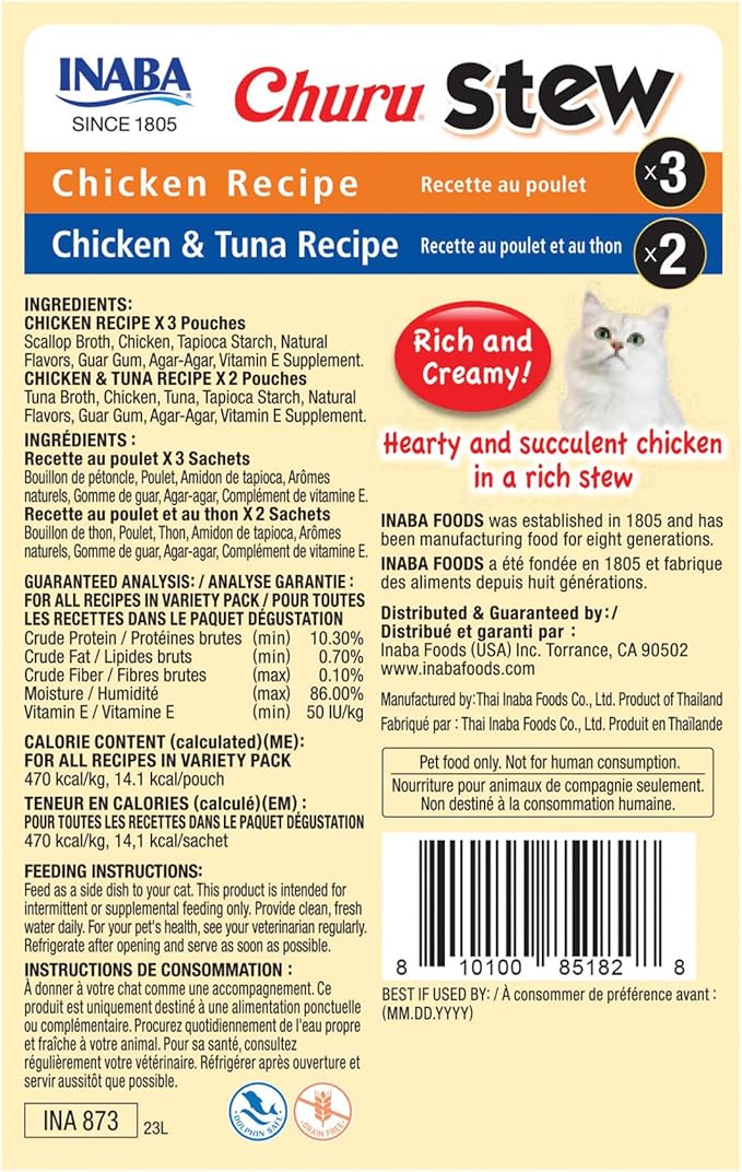 INABA Churu Stew for Cats, Broth Gelée with Shredded Chicken Side Dish with Vitamin E, 1 Ounce per Pouch, 15 Pouches Total, Chicken & Tuna Variety Pack