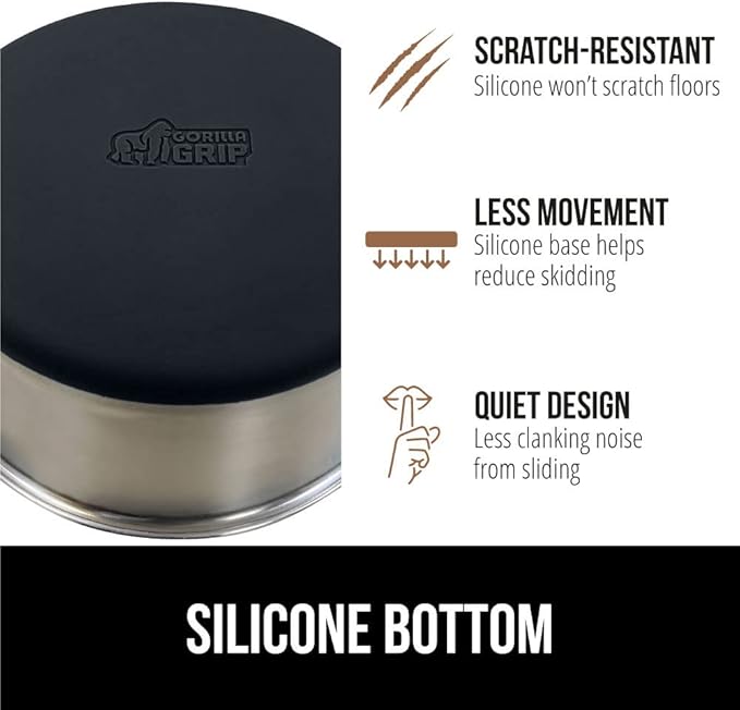 - SILICONE BOTTOM: the Gorilla Grip bowl is constructed from durable silicone that helps keep the bowl steady and won’t scratch your floors; while some over eager eaters may still be able to slide the bowls, the silicone will help prevent much movement; plus, it reduces the noise from clanking and sliding across wood, tile, and more