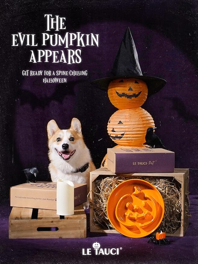 LE TAUCI Ceramic Puzzle Feeder Elevated 3 Cup with Wood Stand for Small Medium Dog & Puppy, Fast Eater Raised Dish Pumpkin Orange