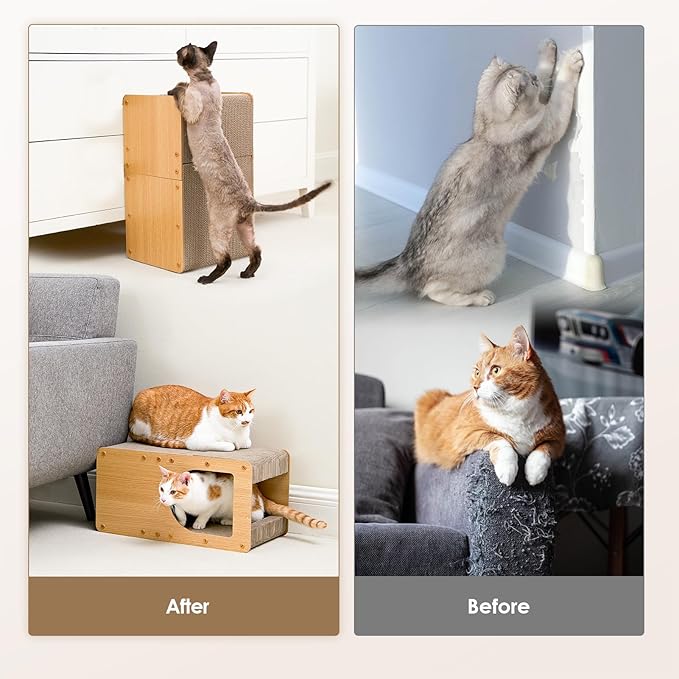 - ๐บINNOVATIVE DESIGN: All sides of cat scratcher house available to scratch, it's a great new toy for any cats. Your cat can not only sharpen its claws but also fully relax, climb, play, and stretch.