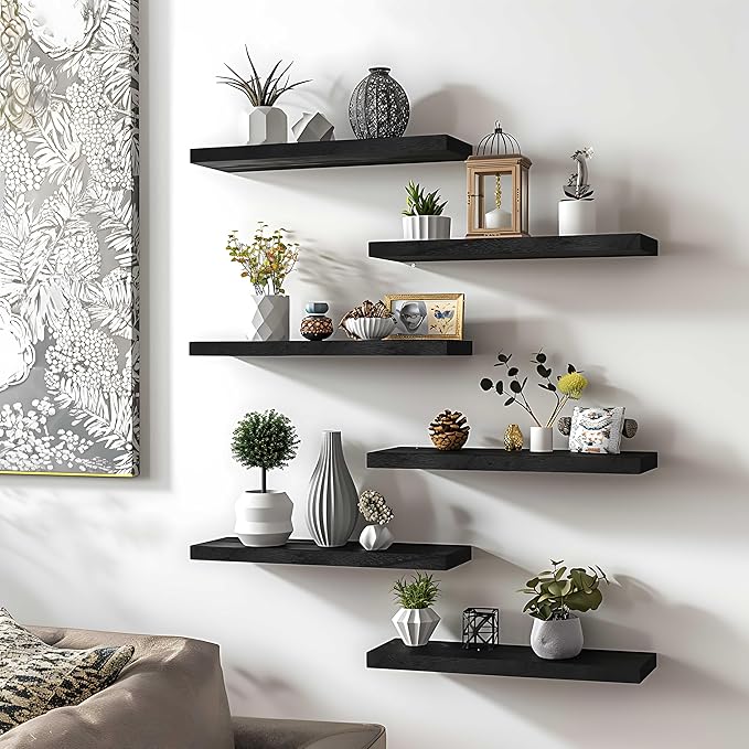 Black Wood Floating Shelves for Wall Rustic Wall Shelf for Bedroom Living Room Set of 4