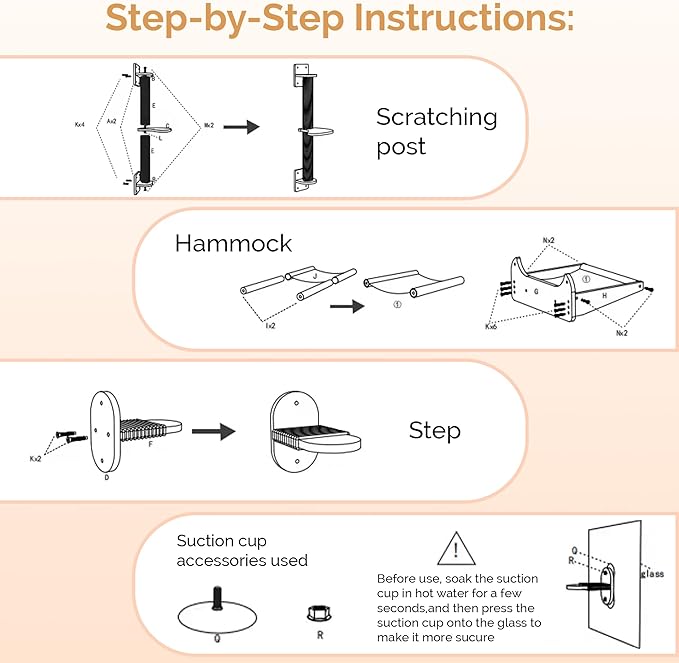 - [How to Use] Easy to follow instructions along with tools and hardware for installation are all included. We recommend using a Phillips-head screwdriver or power drill for wall installations. Apply suctions cups to the surface and press firmly to secure. Watch your cat enjoy! Simply pinch suction cups to remove and relocate. Please note that suction cups are designed for glass/plastic surfaces only. Soak the suction cup in warm water before use. Soft and clean cups will provide the highest level of suction. Cleaning Instructions: Run cat hammock under warm water or wash on gentle cycle. Air Dry
