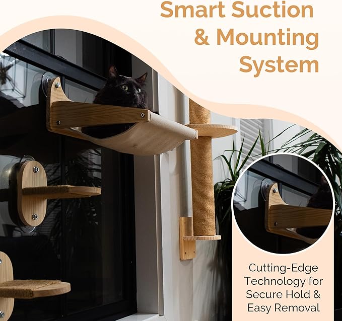 - [Versatility] All four pieces secure to glass and/or walls allowing you to mix and match locations according to your cat's ever-changing preferences. Give your cat a unique view they won't want to leave. Whether they are looking for play or relaxation, find the perfect combination for your furry friend and watch them enjoy themselves for hours! Fits cats of all ages/sizes up to 25 lbs.
