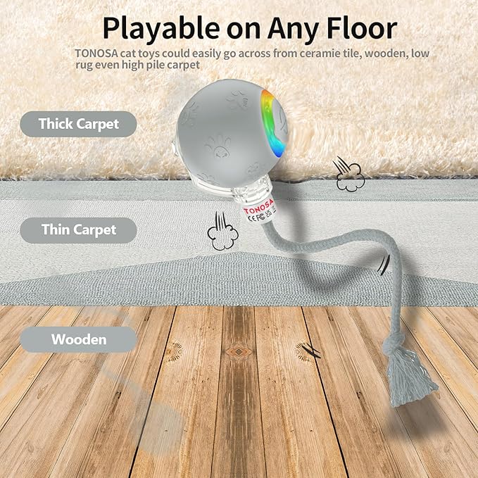 - **Versatile Play on Any Floor**: Equipped with a powerful motor, our electric cat toy rolls effortlessly on various surfaces, including thick carpets, thin rugs, and hard floors. This makes it an excellent choice among interactive cat toys for indoor cats, providing endless fun no matter where they play.