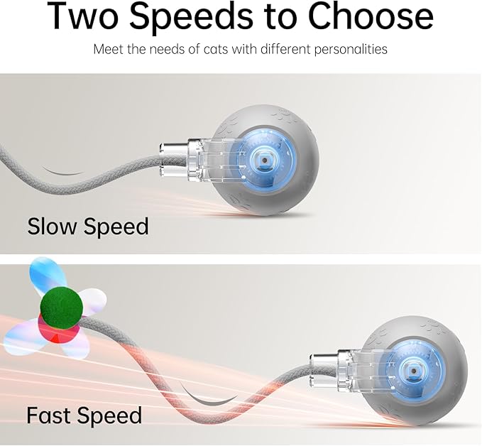 - 【Unique Interesting Tails】 The interactive cat ball toy is equipped with a long rope tail and a furry ball, moving quickly and irregularly like an agile mouse. The unpredictability of the Speedy Tail 2.0 cat toy enhances cats' hunting instincts and accompanies bored indoor adult cats.