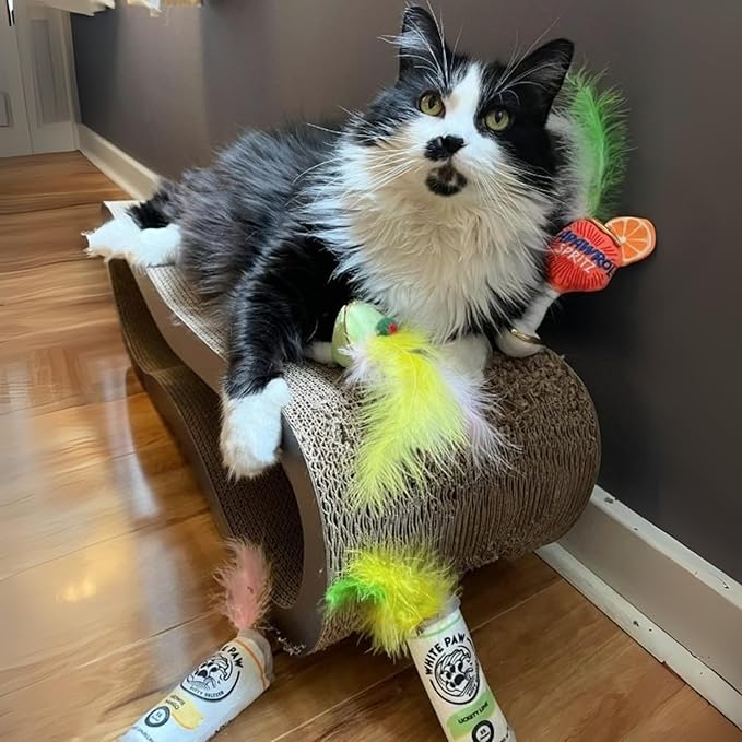 - Funny Parody Cat Toys: Crack open some feline fun with the White Paw Mango & Lime and Purrrona Beer Bottle & Ball set! Featuring two plush cans with feathers, a beer bottle, and a matching plush ball, this playful catnip filled cat toys collection keeps kitties entertained.