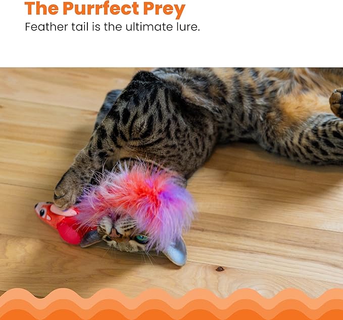 - FEATHER TAIL FOR IRRESISTIBLE HUNTING FUN: designed to trigger natural instincts, the fluffy feather tail flutters and tempts cats to pounce, bat, and chase; perfect for keeping indoor cats entertained while satisfying their need to stalk and hunt