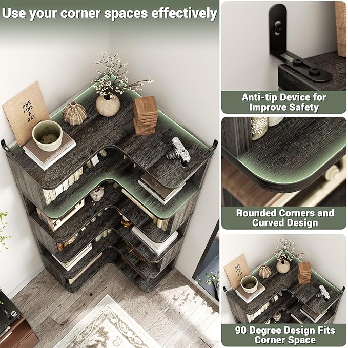 - Space-Saving Corner Design - This corner bookshelf is expertly designed to utilize underused corner spaces in any room, transforming dead zones into functional storage. Its 90° angled back seamlessly fits against walls, while the tiered shelves expand outward to provide ample display/storage area without obstructing walkways, maximizing unused space while offering great stylish storage