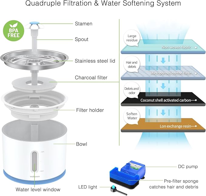 - Circulating filtration system: A replaceable charcoal filter removes dirt and food particles, and a pre-filter sponge designed to catch hair and debris. It provides fresh clean water to your lovely pets.