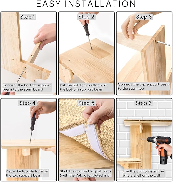 - Easy Wall-Mounted Installation: Just follow the pictures to install. The cat tree for wall saves valuable space while offers your cat an elevated spot to rest or play