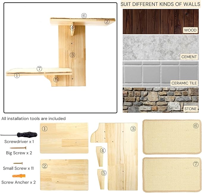 - Comprehensive Package: Come with 3 thickened wood boards, respectively are 2 platforms and a stem board for connection. There are 2 detachable mats for scratching. Installation tools are also included, making setup a breeze