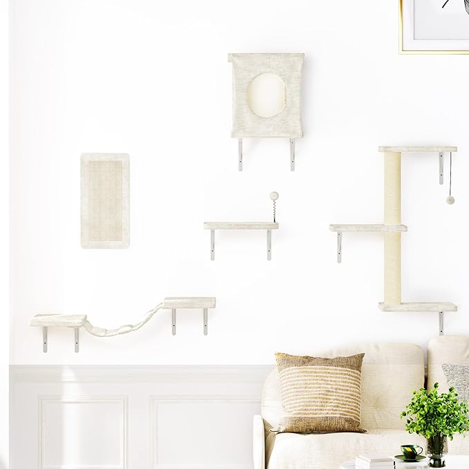 NUNU LAB Cat Wall Shelves Set, 5 Pcs Wall-Mounted Cat Climber with Condo House, Bridge Ladder, Scratching Post, Indoor Cat Furniture Set, Beige