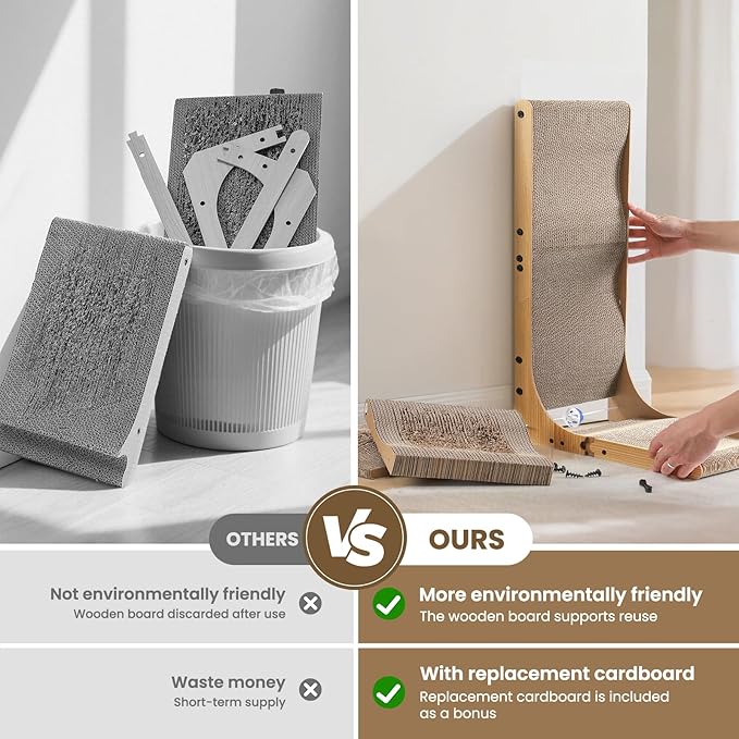 - Comes with Replacement Cardboard: Save money and reduce waste with our cat scratching post, featuring a reusable wooden frame and replaceable cardboard cat scratcher insert. Instead of buying an entirely new cat scratcher, simply swap out the worn cardboard—keeping your cat happy and your wallet fuller! Plus, the sturdy wood edging is built to last, helping you make a more sustainable choice for the planet.