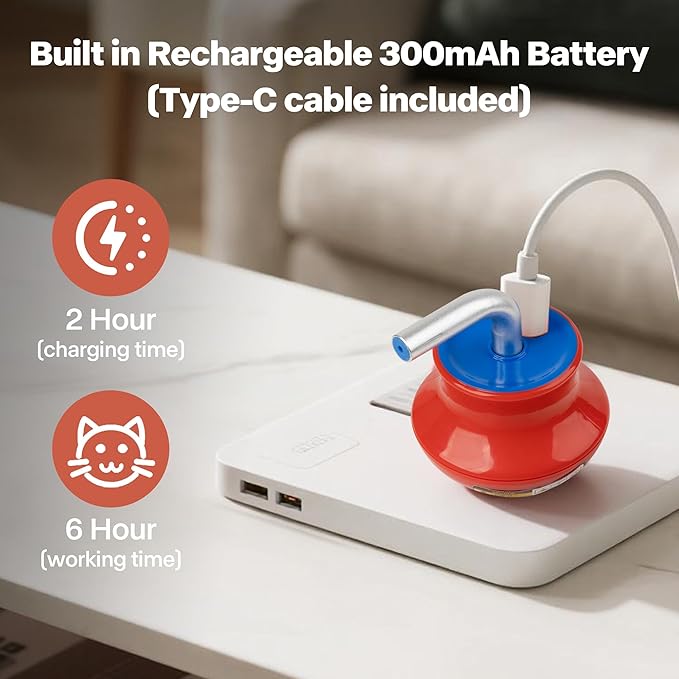 - Convenient Rechargeable Battery: This automatic cat laser toy is designed for effortless enjoyment.In just 2 hours,it charges fully,providing an impressive 6 hours of continuous playtime.This ensures your indoor cat remains engaged for longer periods,offering a solution to boredom