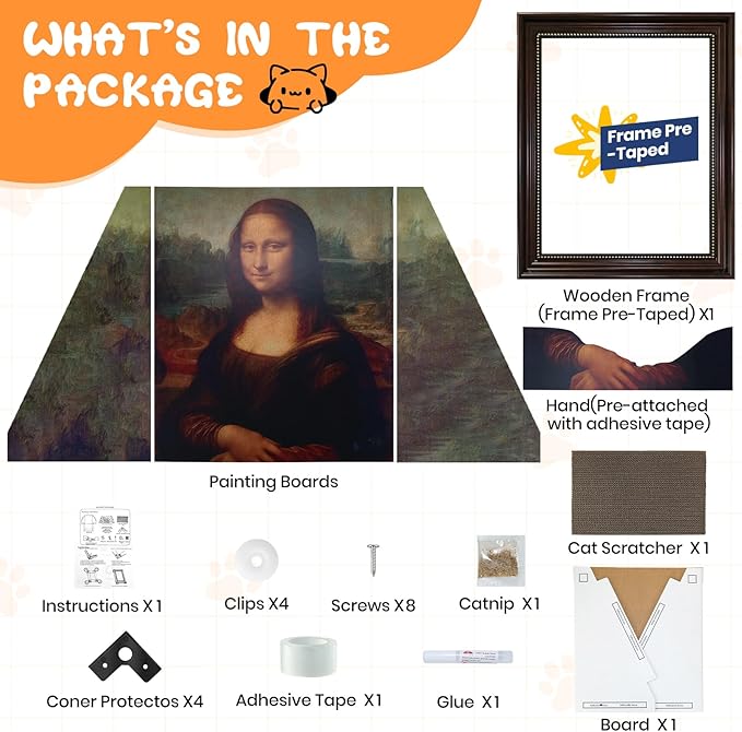- 【Effortless 5-Minute Assembly】Includes clear step-by-step instructions and pre-fixed hardware. No tools required—simply unfold, attach the frame(recommended press for 5 mins after glue, and use appropriate amount of glue), input the painting cardboard, use glue on some areas, and let your cats explore their new cardboard cat house for indoor cats in minutes!