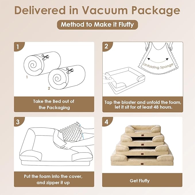 - CARE INSTRUCTIONS: Our dog bed features a removable and washable cover with a zipper closure, making it easy to clean. Remove the foam insert, and the cover can be washed in a machine. Please note that the foam insert is not washable. Allow the bed to expand for 24-49 hours after unpacking.