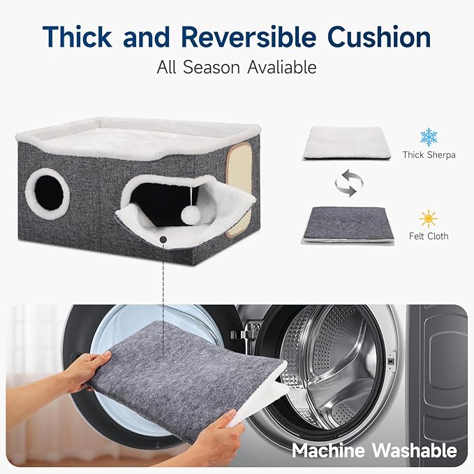 Shikha Cat Beds for Indoor Cats, Extra Wide Cat Cube House for Multi Cats, Foldable Cat Cave Hideaway with Arc-Edge Design & Oval Door, Reversible Cushion for All Seasons, 24"L x 17.7"D x 12.6"H, Grey