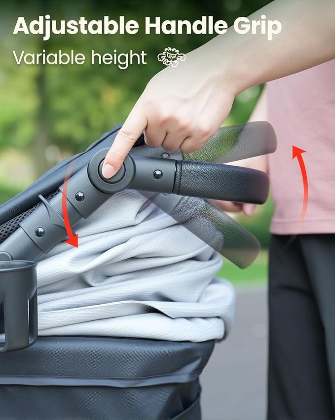- Adjustable Handle Height: This pet stroller for medium dogs features a comfortable leather handle. Height adjusts to suit most owners. Includes cup holder for pet hydration, mesh bag for small items, and extra-large storage basket underneath.