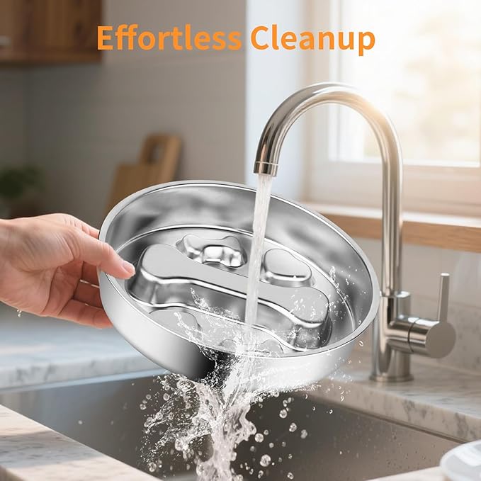 - Premium Stainless Steel - Made from sturdy, food-grade stainless steel, these slow feeder dog bowls offer a safe and long-lasting alternative to traditional plastic bowls. Unlike plastic, the metal dog slow feeder bowl won’t crack, retain odors, or trap food residue. The smooth, rust-resistant surface of the stainless steel dog bowl slow feeder is easy to clean—making it a perfect choice whether you’re serving dry kibble, wet food, or raw meals.
