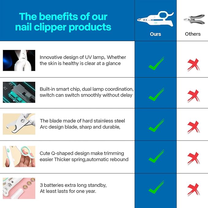 • LED Light Reveals the Quick: This dog nail clipper features a bright LED light to help you see the bloodline inside your pet's nail. This design helps prevent overcutting for a more comfortable experience, ideal for anxious pets or first-time grooming.