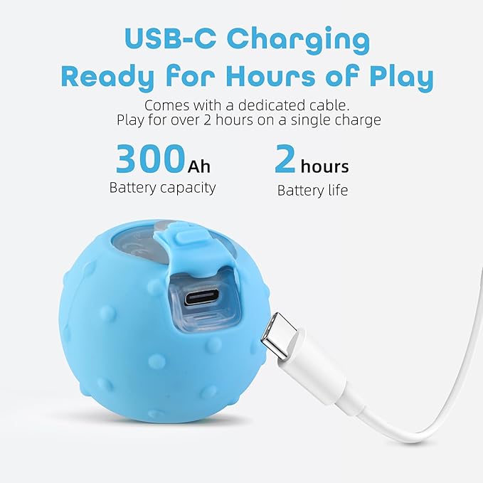 - USB-C Rechargeable, Durable Build & Easy Maintenance – Powered by a USB-C cable (included, 5V/1A adapter recommended) for reliable, repeatable charging. One charge supports multiple play sessions, eliminating disposable batteries. Built tough to withstand zoomies, bumps, and even dog sneak attacks. Simply clear trapped hair after play to maintain peak performance.